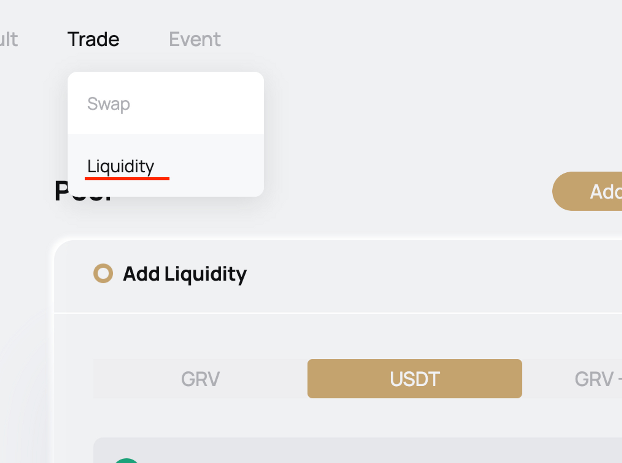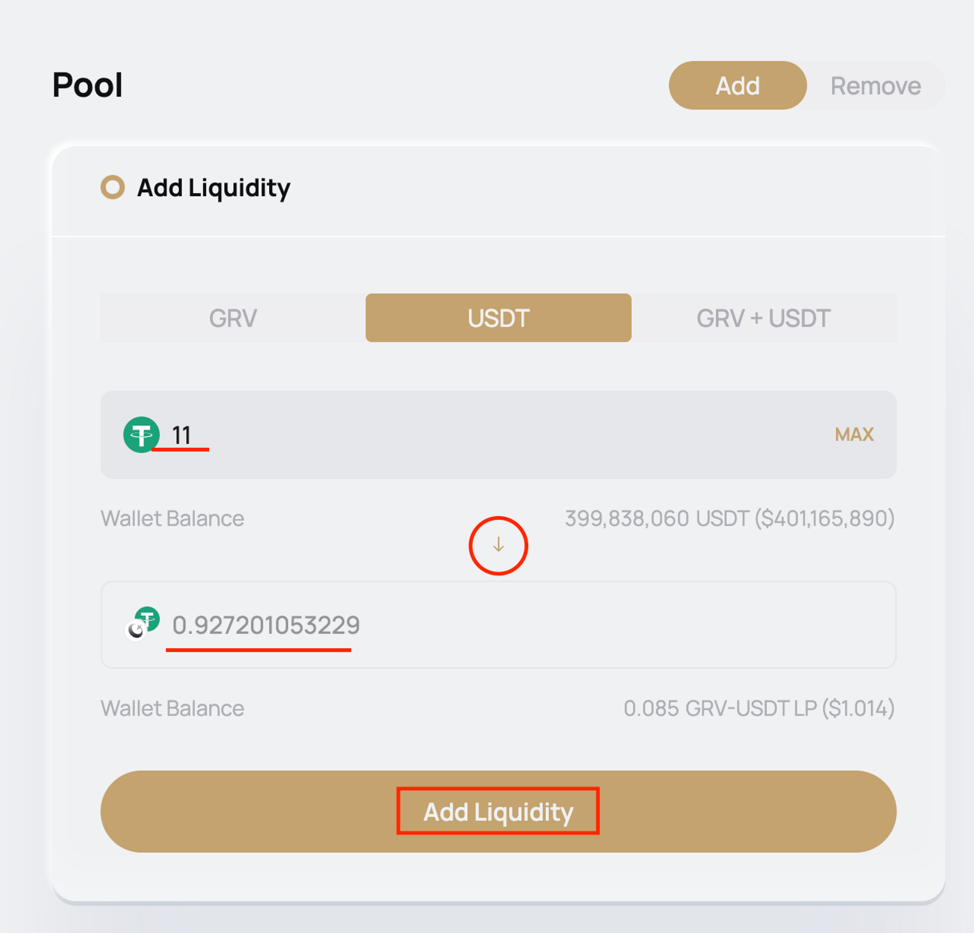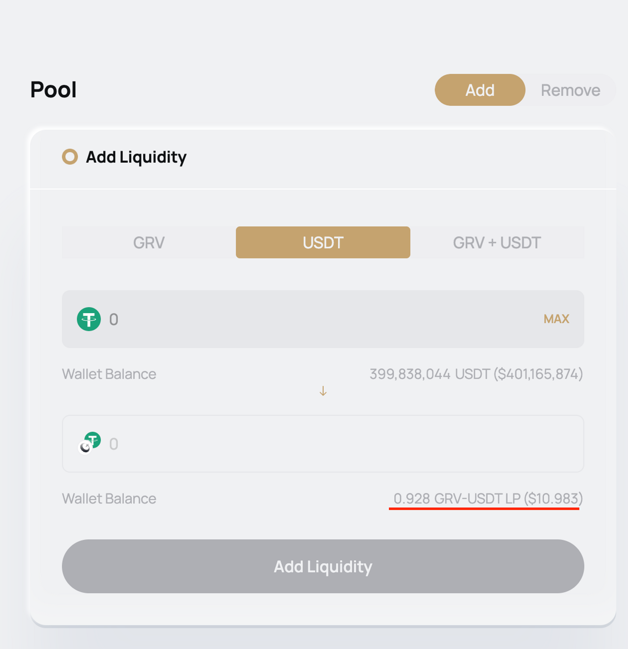 The liquidity supplied to the GRV-USDT pool becomes GRV-LP.